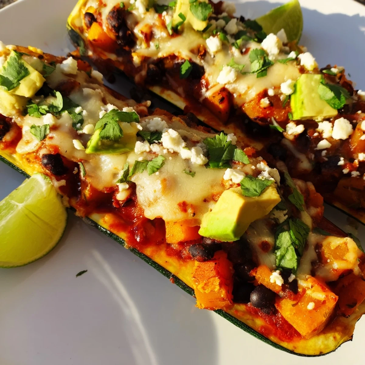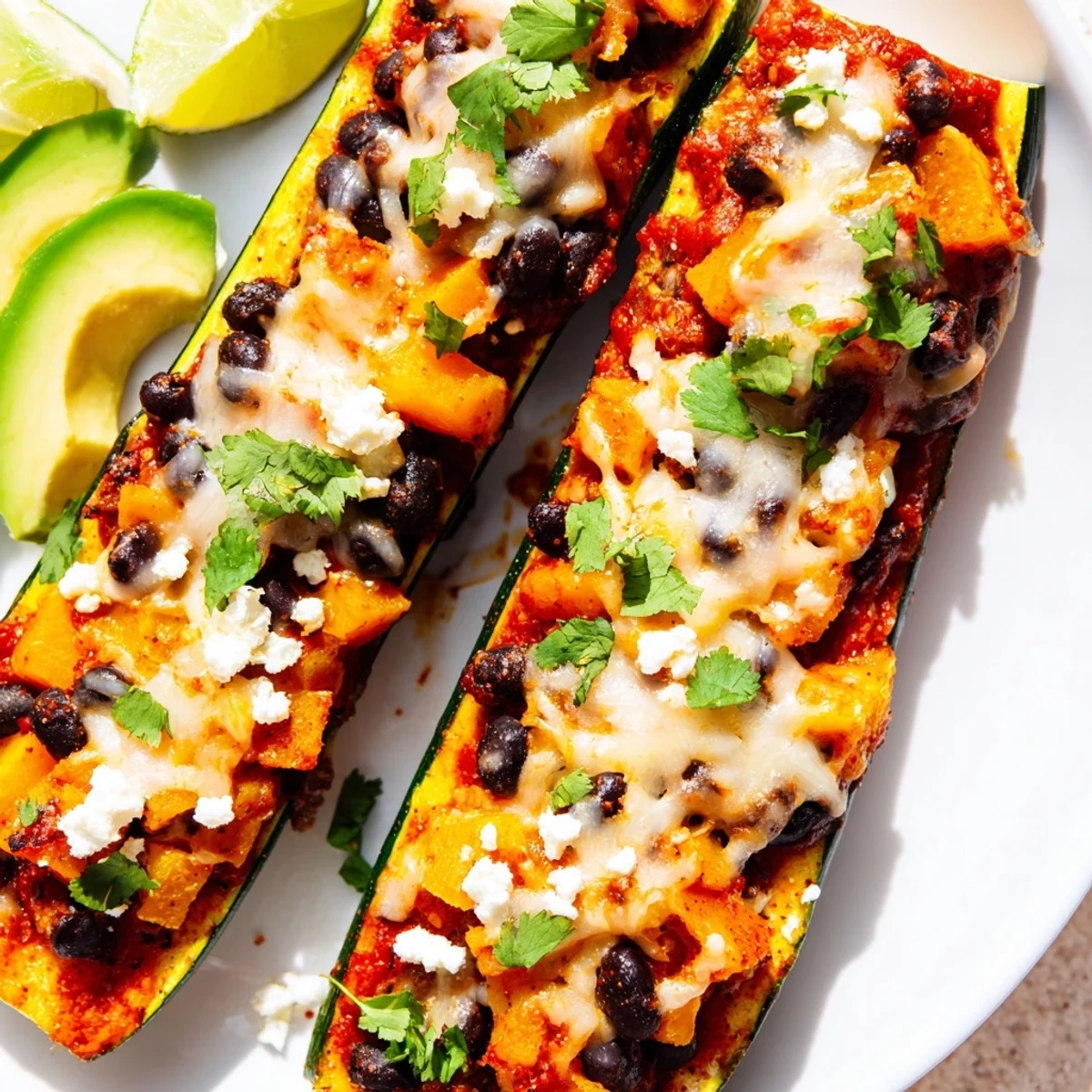 This dish features zucchini halved and scooped to create boats filled with a savory blend of roasted butternut squash, black beans, and onions. The filling is spiced with chili powder, cumin, and smoked paprika, then topped with enchilada sauce and melted cheese. Baked until bubbly and garnished with fresh cilantro, avocado, and lime, it’s a colorful and satisfying option that highlights fresh vegetables and bold flavors in a simple, nutritious meal.