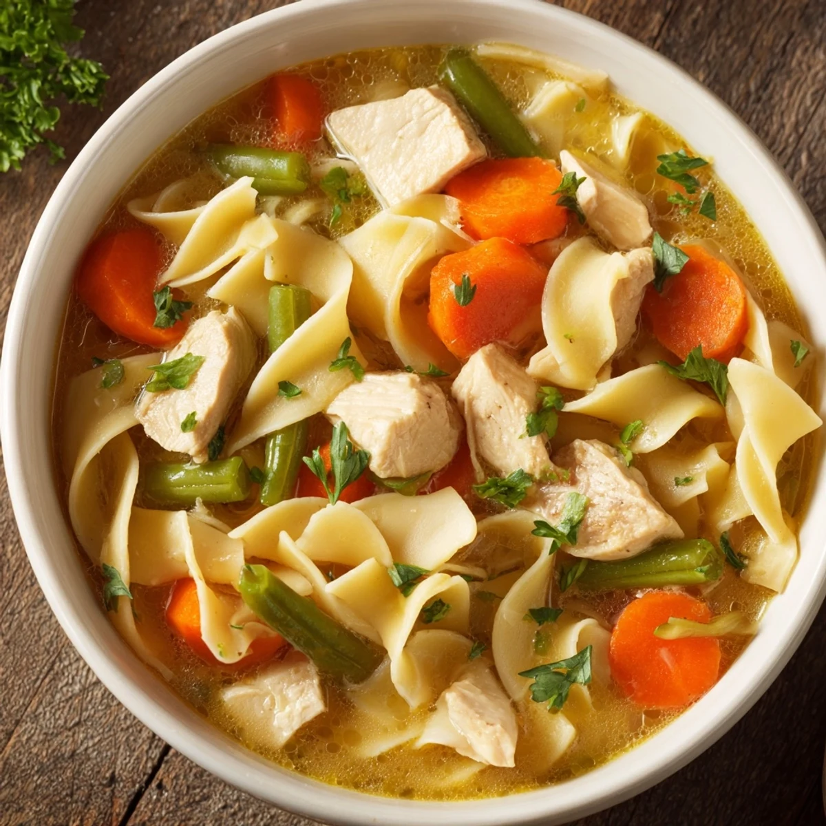 This hearty meal combines tender chicken pieces with a medley of fresh vegetables, including carrots, celery, green beans, and peas. Simmered gently in a flavorful broth infused with herbs like thyme and parsley, soft egg noodles complete this wholesome dish. Quick to prepare and packed with nourishing ingredients, it offers a cozy, satisfying option for any day of the week. A splash of lemon juice brightens the flavors, and fresh parsley adds a vibrant finish.
