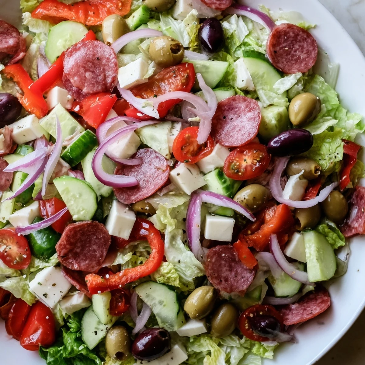 This Italian chopped salad combines crisp Romaine lettuce with cherry tomatoes, cucumber, red onion, and roasted red peppers for maximum crunch and freshness. The medley includes savory Genoa salami, creamy mozzarella, salty Parmesan, Kalamata olives, and tangy pepperoncini for authentic Italian flavors.