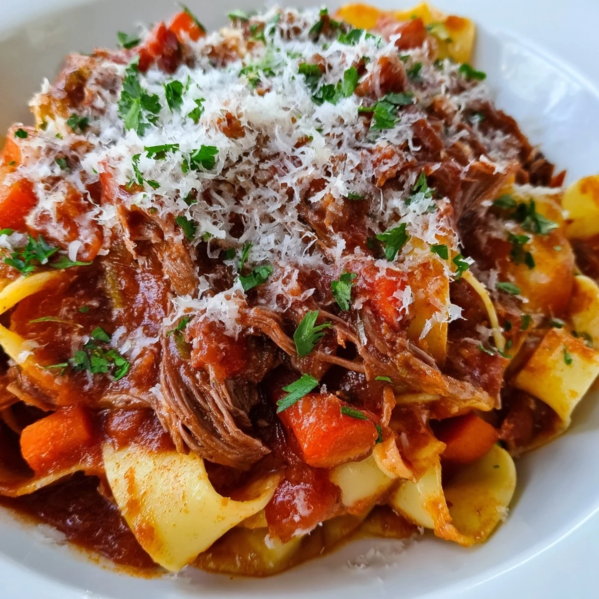 This dish features beef chuck roast slow-cooked with aromatics, tomatoes, and herbs until very tender. The shredded meat creates a deeply flavorful sauce ideal for coating wide pappardelle pasta. Finish with fresh Parmesan and parsley for a classic Italian meal.