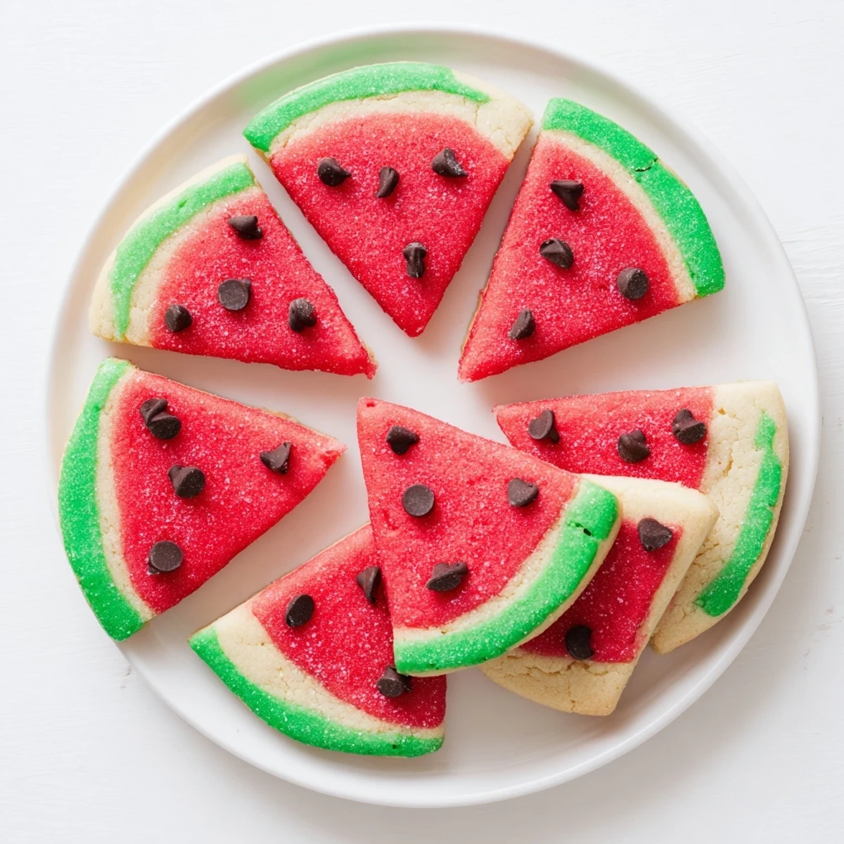 These delightful watermelon slice cookies combine vanilla-flavored dough tinted in vibrant red and green to create realistic fruit appearances. The process involves coloring two portions of dough, rolling them into a log formation with green wrapping around red, chilling until firm, then slicing into wedges. Mini chocolate chips add the perfect seed detail while baking produces tender, melt-in-your-mouth treats ideal for summer gatherings, children's birthday parties, or anytime you want whimsical desserts. The 40-minute timeline includes essential chilling time for clean slices, and the yield of approximately two dozen cookies makes them excellent for sharing.